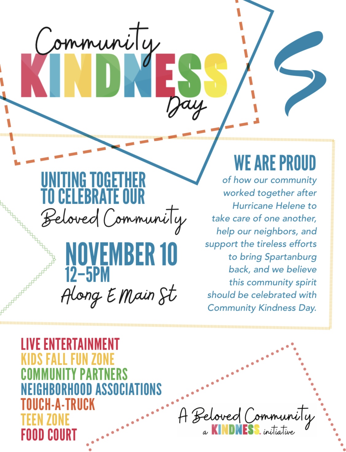 Come celebrate the heart and resilience of our community at Community Kindness Day! Join along on November 10th from 12-5 PM along East Main Street for live entertainment, a kids’ fall fun zone, delicious food, and so much more. Let’s unite for a brighter Spartanburg!